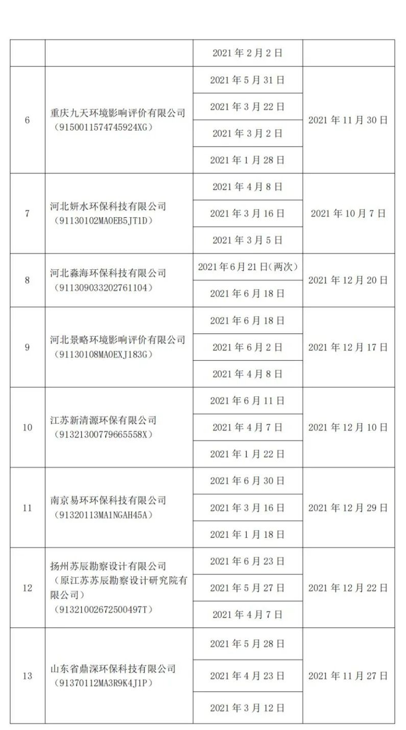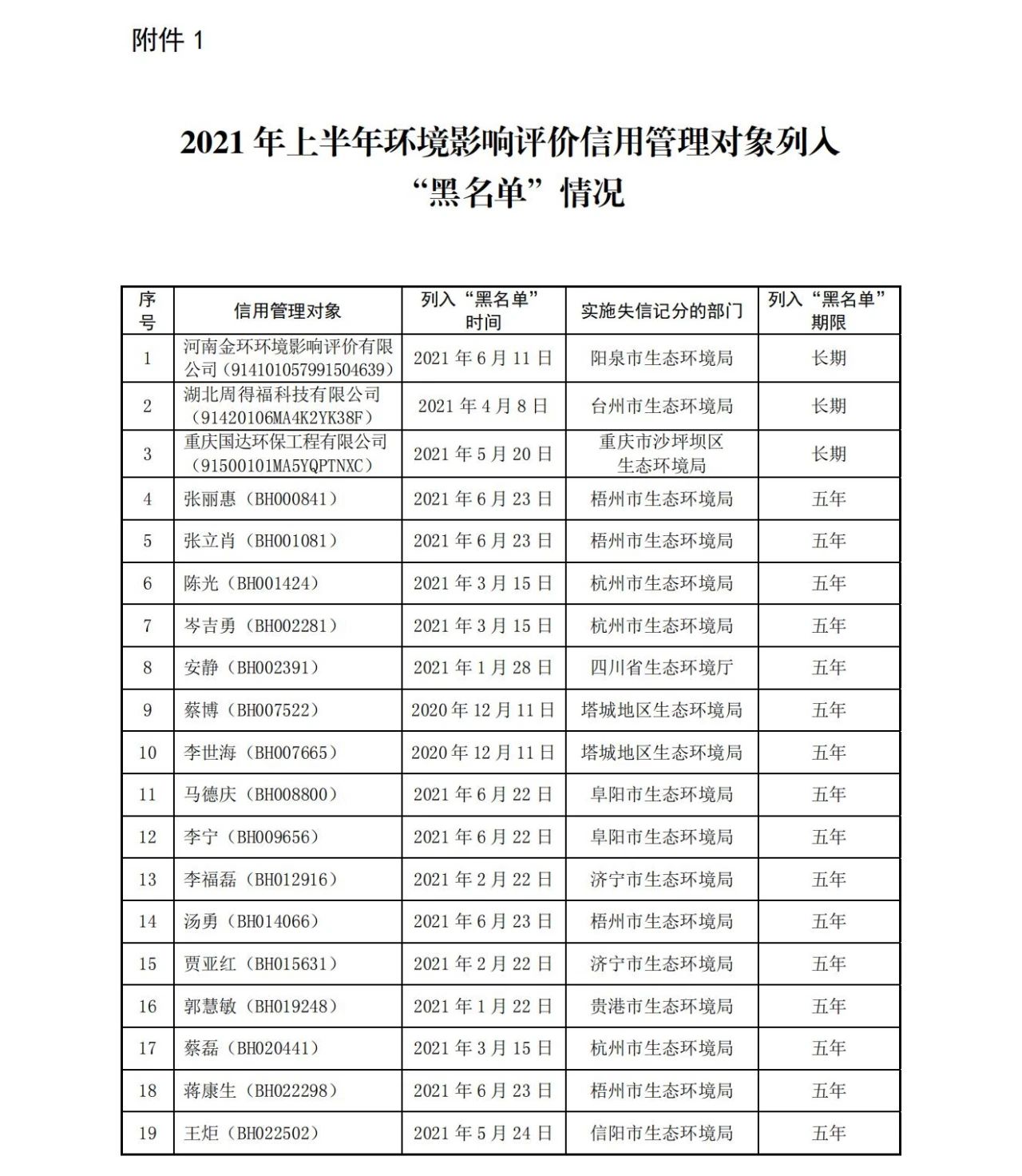 根據《建設項目環境影響報告書(表)編制監督管理辦法》相關規定,現將2021年上半年被環境影響評價信用平臺(以下簡稱信用平臺)列入限期整改名單和環境影響評價失信“黑名單”(以下簡稱“黑名單”)的信用管理對象情況通報如下。2021年1月1日至6月30日,河南金環環境影響評價有限公司、湖北周得福科技有限公司、重慶國達環保工程有限公司3家單位和22人因所編制的建設項目環境影響報告書(表)存在嚴重質量問題,受到禁止從事環境影響報告書(表)編制工作的處罰,被信用平臺列入“黑名單”。具體情況詳見附件1。2021年1月1日至6月30日,重慶大潤環境科學研究院有限公司、江西悅成環保技術服務有限公司、河北華睿風翰環保科技有限公司等119家單位和79人因在建設項目環境影響報告書(表)編制過程中存在失信行為較多,被信用平臺列入限期整改名單。其中,40家單位和23人被2次或2次以上列入限期整改名單。具體情況詳見附件2。