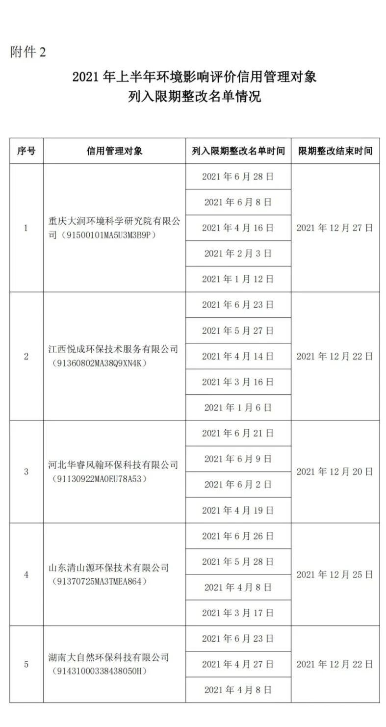 2.2021年上半年環境影響評價信用管理對象列入限期整改名單情況